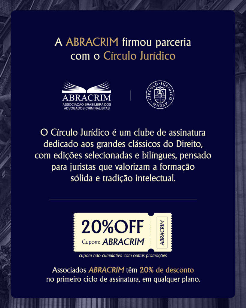 A Associação Brasileira dos Advogados Criminalistas (Abracrim) anunciou uma nova parceria institucional que reforça o compromisso da entidade com a formação e o aprimoramento contínuo da advocacia criminal. A entidade passa a colaborar com o Círculo Jurídico, um clube de assinatura dedicado à publicação de grandes clássicos do Direito em edições selecionadas, bilíngues e com alto padrão editorial.