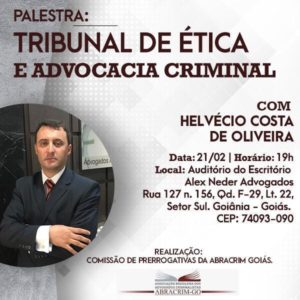 Tribunal de Ética e Advocacia Criminal. Este é o tema da palestra do advogado Helvécio Costa de Oliveira, que será realizada nesta quinta-feira (21), a partir das 19 horas, no auditório do Escritório Alex Neder Advogados, no Setor Sul, em Goiânia. A entrada é franca.