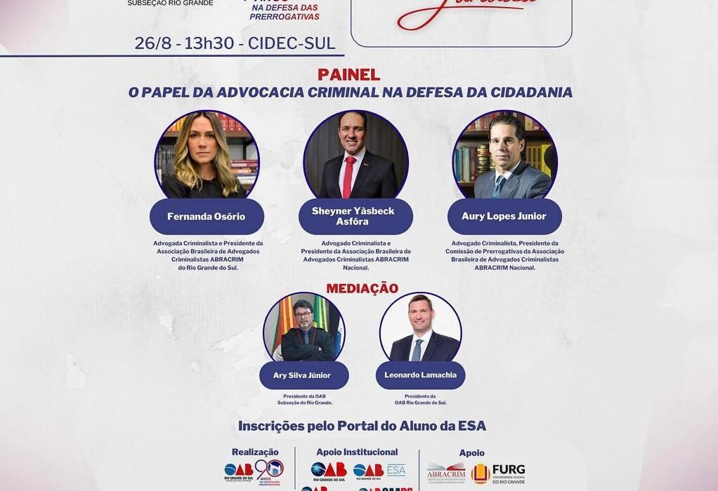 O presidente da Associação Brasileira dos Advogados Criminalistas (Abracrim), Sheyner Asfóra, estará presente na Jornada Jurídica da Ordem dos Advogados