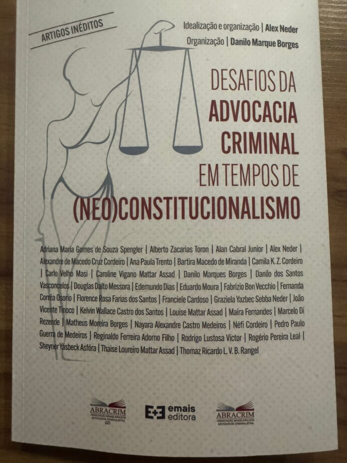 Será lançado nesta segunda-feira (25), na sede da Escola Superior da Advocacia de Goiás (ESA-GO), no Setor Sul, em Goiânia, o livro “Desafios da Advocacia Criminal em Tempos de Neoconstitucionalismo”, organizado pelo advogado criminalista e presidente da Associação Brasileira dos Advogados Criminalistas – Regional Goiás (Abracrim-GO), Alex Neder, e pelo conselheiro nacional da Abracrim Danilo Marques Borges. A obra reúne reflexões de renomados profissionais do Direito Penal e Processual Penal de Goiás e nacionais, abordando os desafios atuais da advocacia criminal diante das transformações jurídicas e sociais contemporâneas.